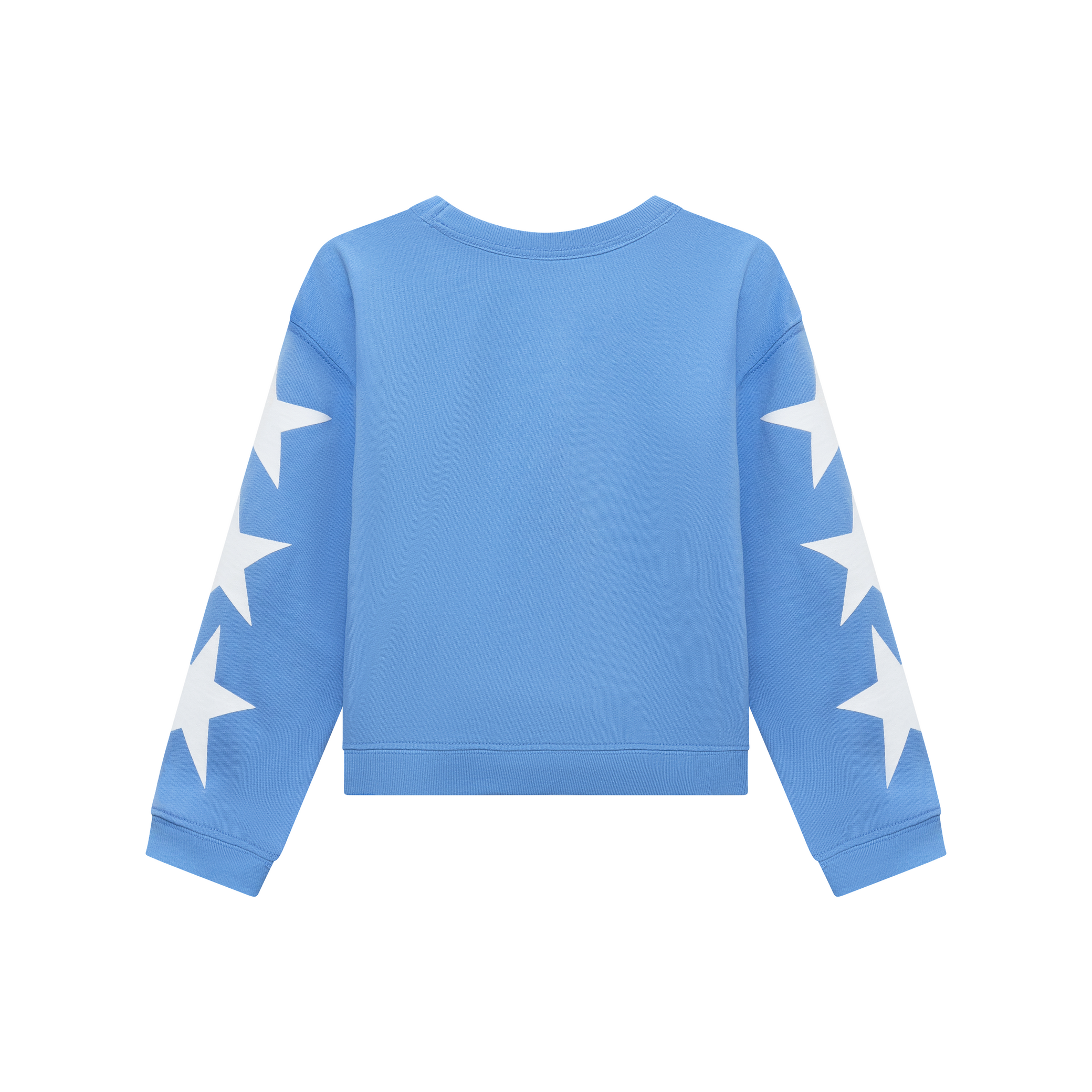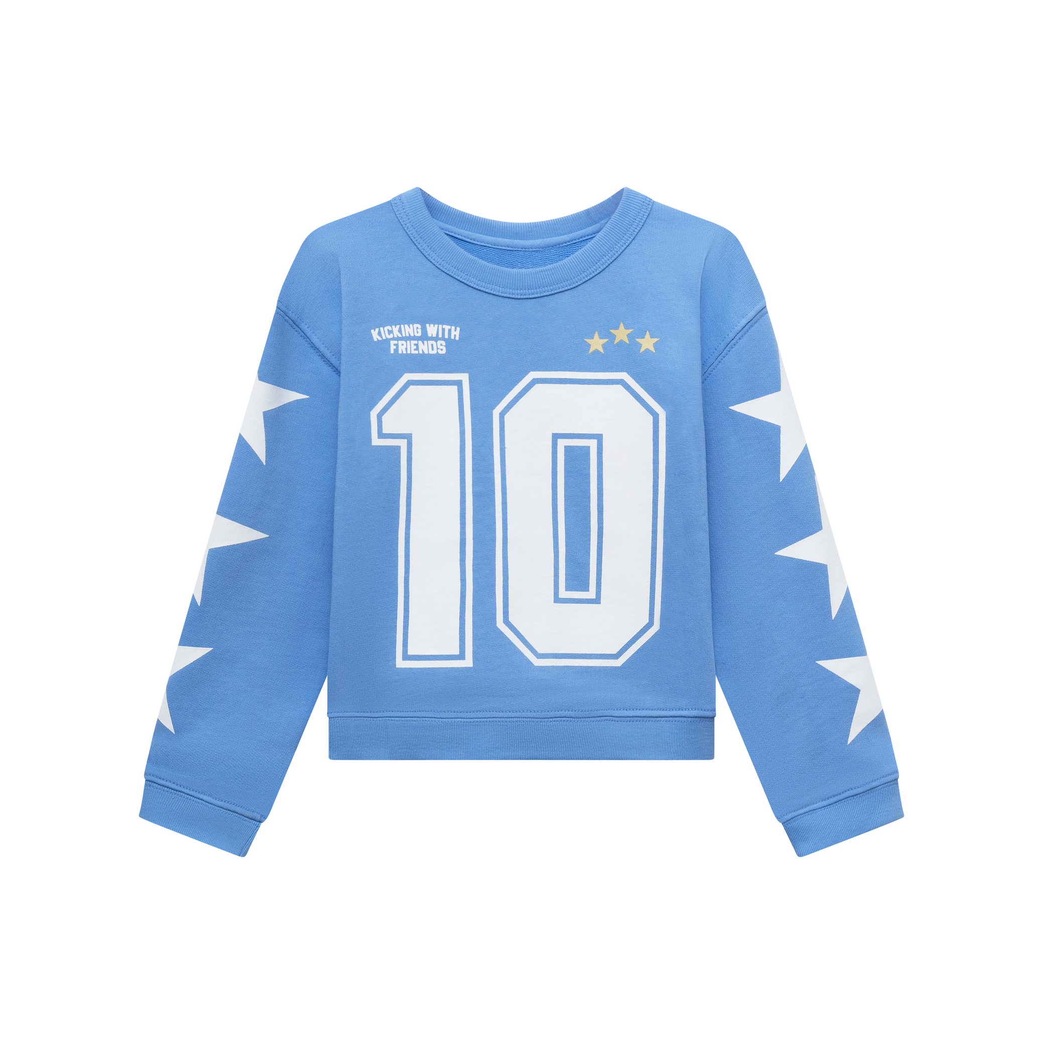 Blue 10 Crewneck. Screen print graphic on front and sleeves. "Made In USA with Care" woven label sewn on left side. Sports-inspired design, classic fit, and ribbed cuffs. Made in USA.